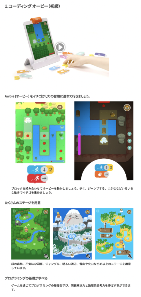 Osmo コーディング スターター キットを利用しますので、対象年齢は5才から10才、iPadと付属のブロックを使って、3種類のプログラミングゲームで初級から上級まで段階的にプログラミングのスキルを身につけることができます。